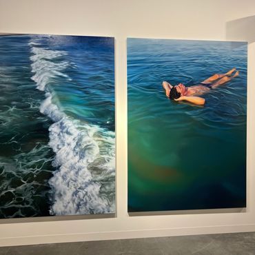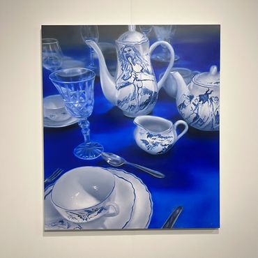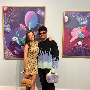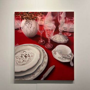 Navigating Art Basel is an immersion in a sea of people and countless booths, but amid the crowd, the spectacle of both the attendees' outfits and the majestic blue-chip art is unmissable. Despite not being a fervent admirer of the color blue, the two paintings by Hartmann managed to captivate me with their calm and dreamy allure. Christopher Hartmann, recognized for his vibrant and intricately detailed oil paintings, delves into themes of intimacy, emotional connections, loss, and the intricate dynamics of human relationships. Drawing inspiration from romantic motifs, his work often explores boundaries, isolation, and co-dependence, creating a nuanced dialogue within the realm of contemporary art.