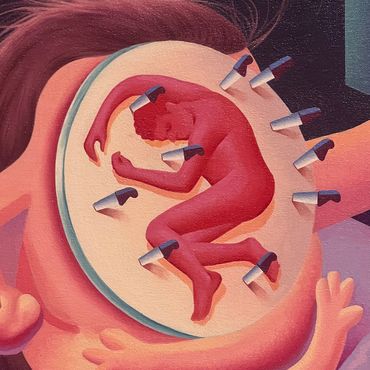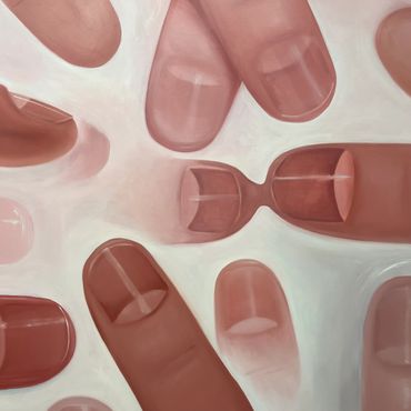 Tomasz Kręcicki's painting elicited a sensation akin to the delicate touch of a fingertip meeting water, where the connection feels seamless and unified. The artwork, adorned with soft hues of pink on enlarged fingers against a milky background, embodies a sense of captured movement within the canvas. The fingers, appearing to point or gently poke the surface, convey a dynamic quality. Kręcicki draws inspiration from his immediate surroundings—the home and the street—manipulating their context and scale. By placing these everyday elements at the forefront in a central composition, he imbues them with metaphorical meanings, offering viewers a nuanced perspective on the familiar.