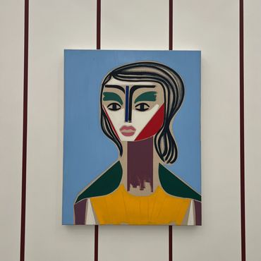 As I stepped into the Untitled fair, VIGO gallery took center stage with a group exhibition that immediately drew my attention. Among the featured artists, Henrik Godsk's work emerged as particularly captivating, characterized by a serene minimalism and geometric precision. Reminiscent of the influences of Fernand Léger and Pablo Picasso, Godsk's cubistic portraits exhibit controlled brushwork, geometric lines, flat surfaces, and tight compositions. In a nuanced expansion of the genre, Godsk both honors and challenges the works of these iconic artists. Within his angular paintings, he strips away the traditionally busy and saturated style of Cubism, presenting instead minimal compositions where a lone figure, typically a woman, stands against a monochrome backdrop. This departure from the norm adds a unique dimension to the cubistic tradition, allowing Godsk's art to shine as a contemporary interpretation of a classic style.