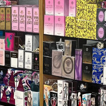 Louise Jones, well-known for her captivating floral murals, on buildings and local businesses truly surprised me with her latest creation. The intricacies of the perfume stand instantly transported me back to my childhood in LA, where I used to accompany my mother to purchase gifts for our family in Colombia. Those downtown shopping trips were a cherished memory, and the details in Jones' artwork evoked the nostalgia of those moments.